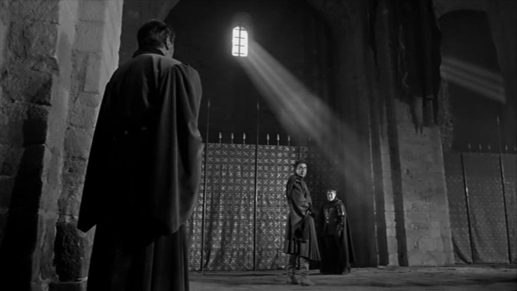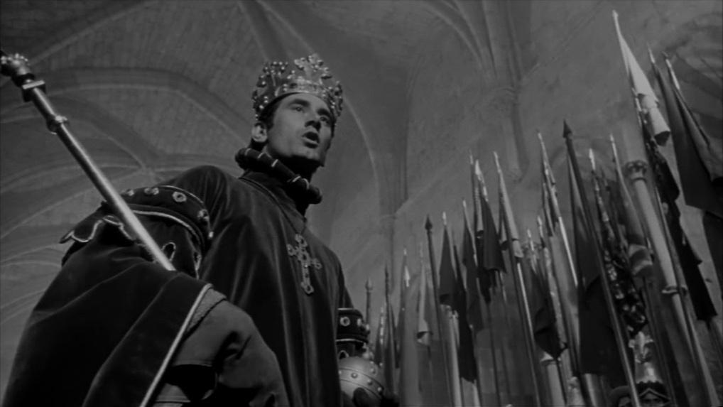 Car, par bien des aspects, Falstaff perpétue et perfectionne les partis pris adoptés par ses précédentes adaptations shakespeariennes et, par extension, du reste de sa filmographie. Le ton du film se veut théâtral, fidèle à son matériau d’origine, qu’il s’agisse des dialogues déclamés dans un anglais ancien ou du jeu exacerbé des comédiens. Loin toutefois de se borner à filmer des acteurs en costume proférer de longues tirades, Welles fait partie, aux côtés notamment d’Ingmar Bergman, des cinéastes qui auront le mieux su tirer parti de l’héritage du théâtre en le traduisant en des termes purement filmiques. Le réalisateur use et abuse de ses figures de style fétiches, toujours à dessein : la contre-plongée accentue ainsi la posture noble et arrogante des plus illustres personnages tandis que le clair-obscur met en relief les tourments de figures torturées par les dilemmes moraux et les positionnements ambigus. Welles pense le champ de la caméra comme un véritable espace scénique, au sein duquel la position de chaque comédien importe et où la superposition de deux visages ne peut être que lourde de sens pour illustrer une relation ou une dynamique spécifique.